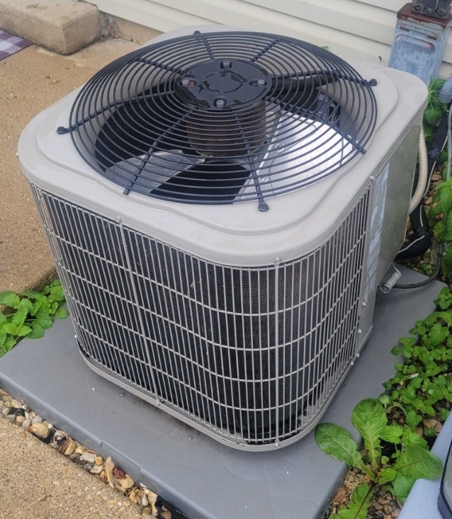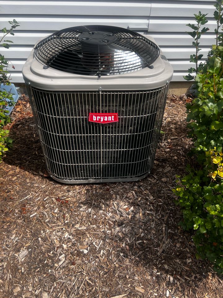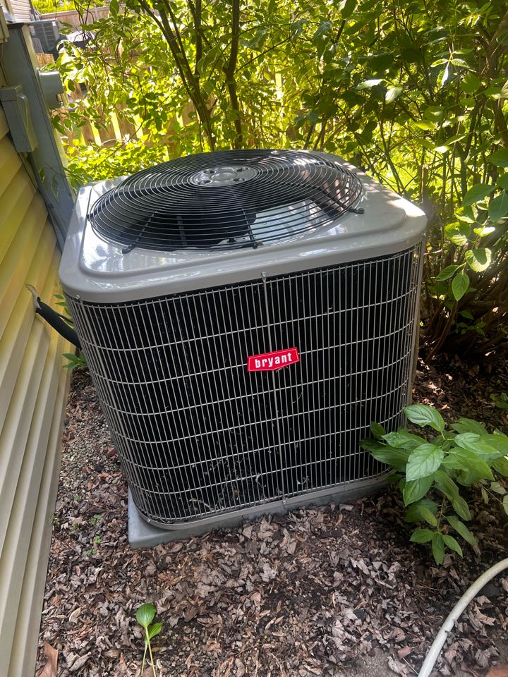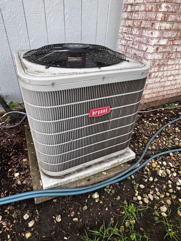 Cleaning and testing the efficiency of the Bryant air conditioning. Checking the pressure of the unit to ensure it's with factory specifications. Cleaning the outdoor coil and changing the filter.