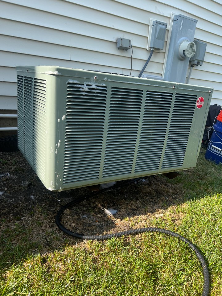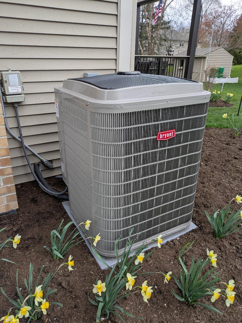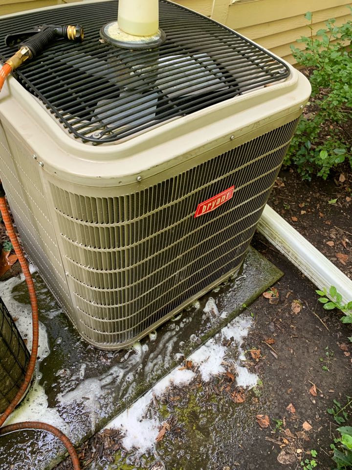 Cleaning and testing the efficiency of the Bryant air conditioning. Checking the pressure of the unit to ensure it's with factory specifications. Cleaning the outdoor coil and changing the filter.