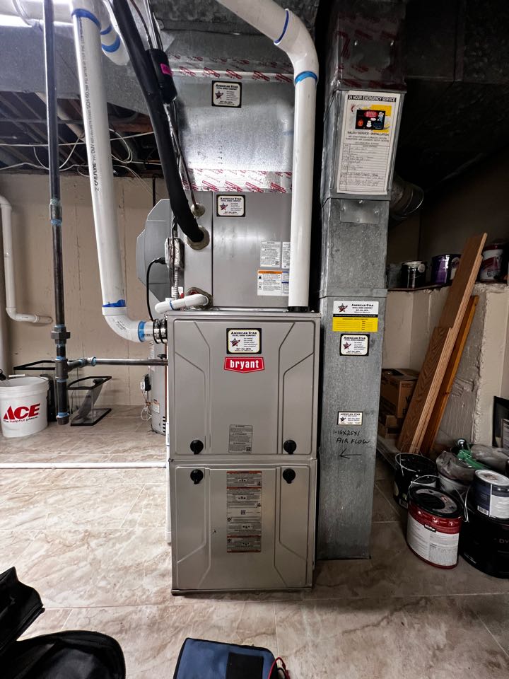 Performing annual furnace maintenance check on high efficiency Bryant furnace. Checking flame rectification. Taking heat rise.