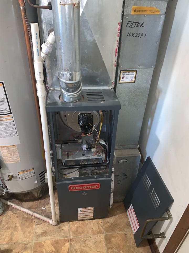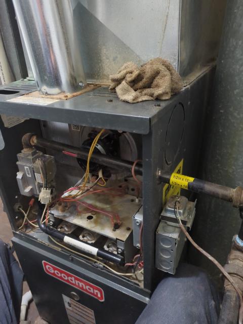 Performing annual furnace clean & check on Goodman unit. Taking heat rise. Checking amp draw.