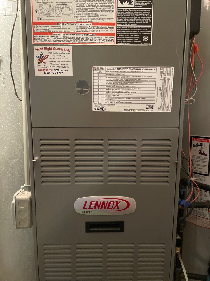 Performing preventative maintenance check on Lennox unit. Replacing air filter. Taking combustion analysis reading.