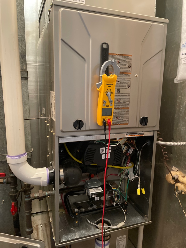 Performing annual furnace maintenance check. Taking amp draw & heat rise. Checking air filter.