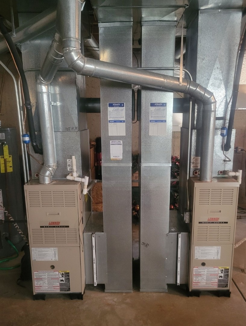 Completing the tune ups on both older Lennox furnaces. Cleaning the units and testing the operation of the units. Testing for CO in the air stream and saftey. Also flushing the water heater and adjusting how much water the humidifiers are using.
